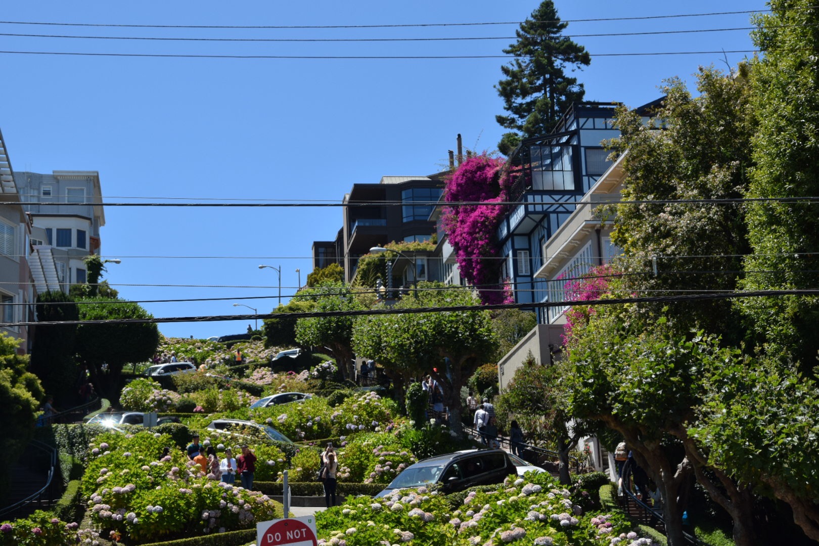8 virages et une route qualifiée des plus sinueuses du monde (on s’en serait douté), Lombard street est également une de celles les plus photographiées au monde. Ce ballet de voitures descendant cette rue au dénivelé important, bordée de fleurs est un vrai spectacle pour les touristes (comme nous!)